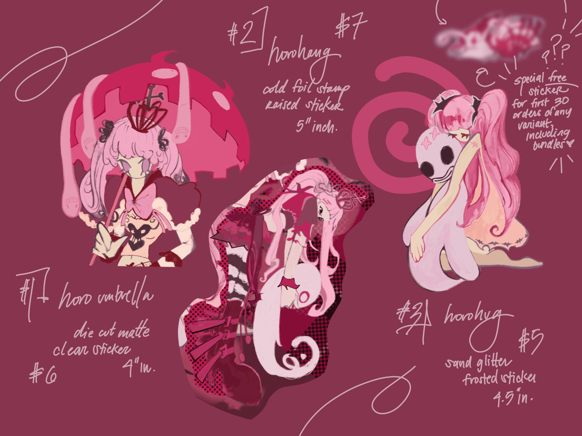 update: horohang and horohug are now in stock to purchase individually with their own listings! horoumbrella is under reconstruction as well as mystery stickers, hang tight <3